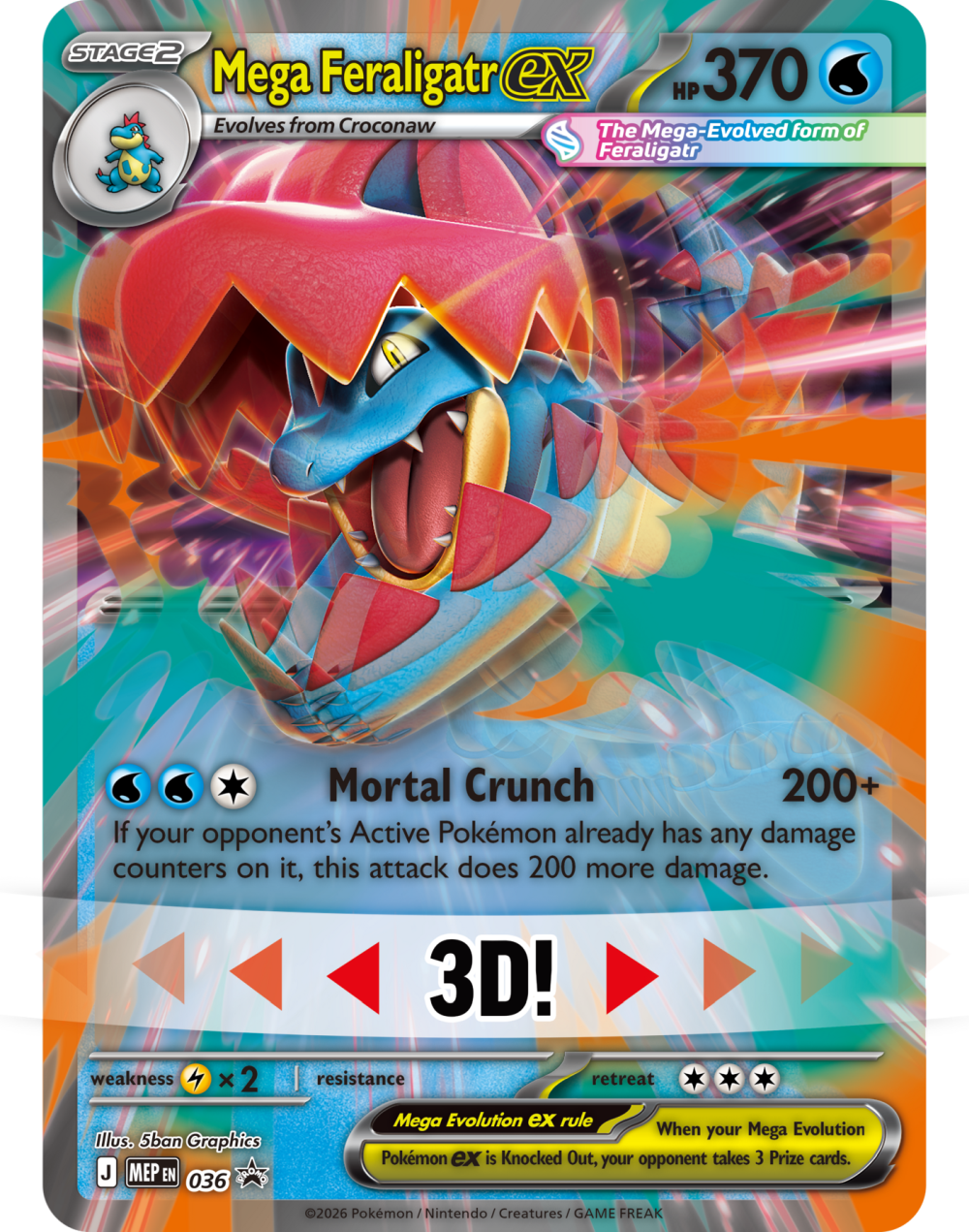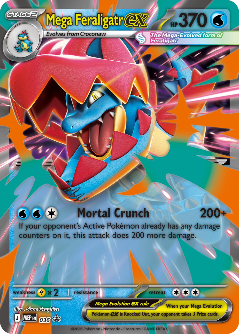 Zbuduj więź, która pozwoli Twojemu Pokémonowi przekroczyć granice swojej mocy dzięki Mega Ewolucji! Dzięki kłapiącym szczękom i ostrym pazurom Mega Feraligatr ex namierza osłabione Pokémony przeciwnika, zadając atak Mortal Crunch!