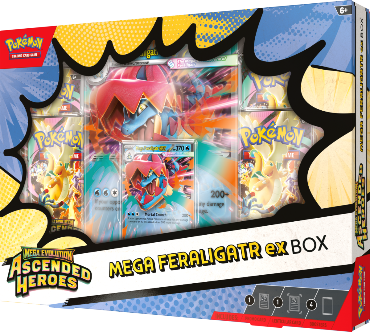 W zestawie Pokémon TCG: Mega Evolution - Ascended Heroes - Mega Feraligatr ex Box znajdziesz Mega Feraligatr ex jako grywalną kartę promo foil, a także powiększoną kartę lentikularną z dynamiczną grafiką oraz cztery boostery ze specjalnego dodatku Mega Evolution - Ascended Heroes.